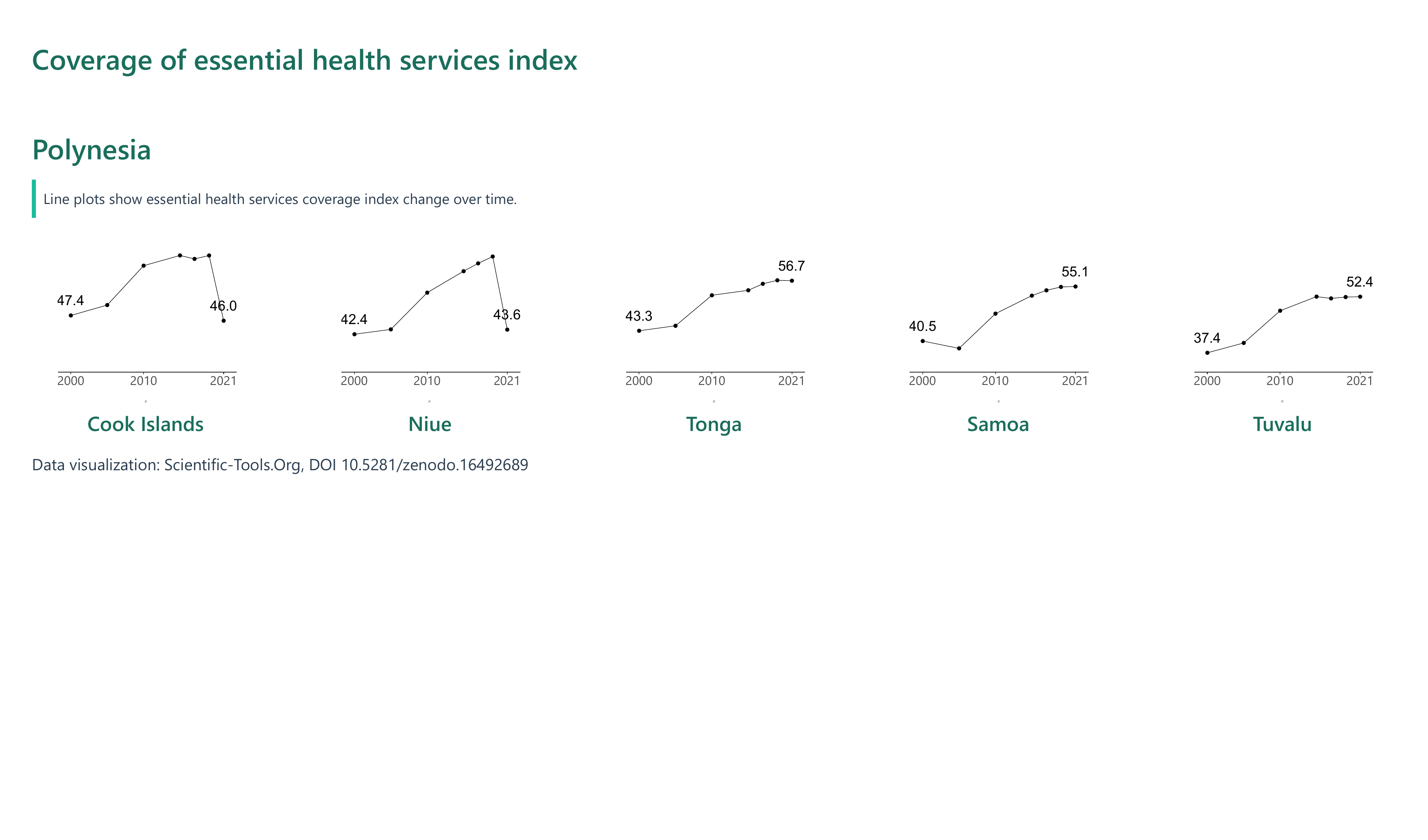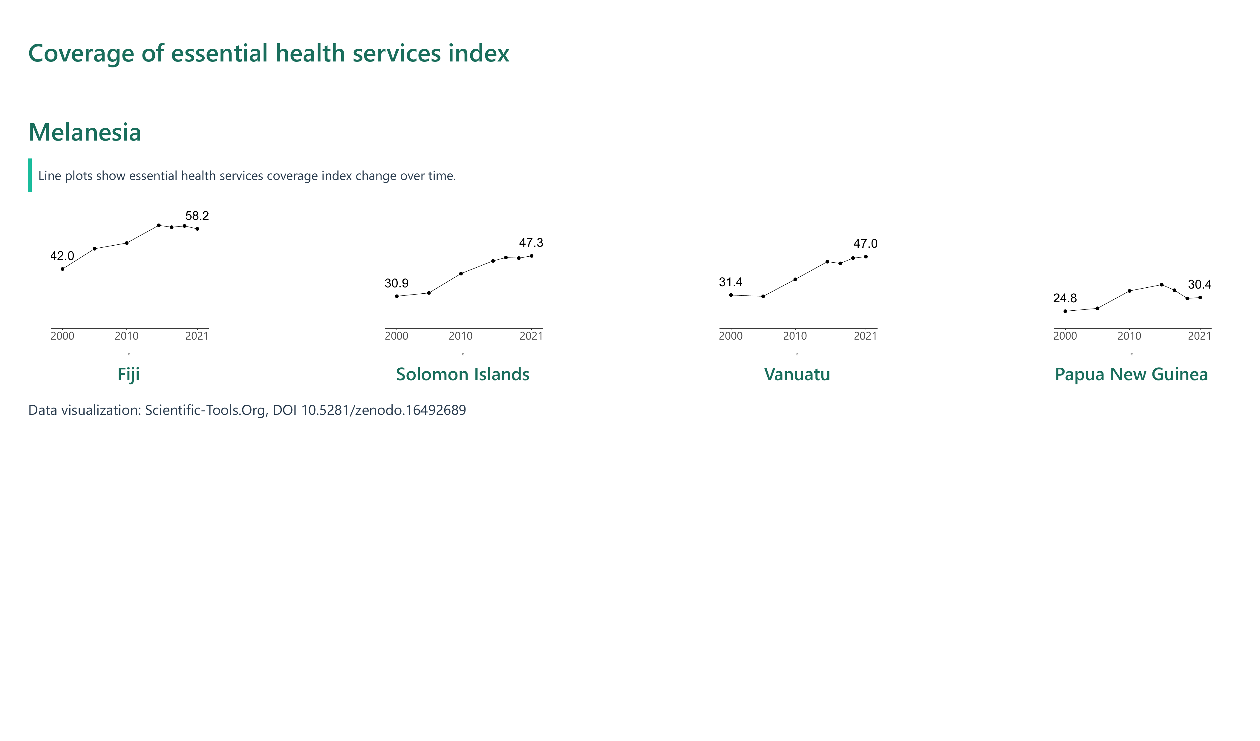 In contrast, Papua New Guinea saw only a modest rise from 24.84 in 2000 to 30.39 in 2021, with recent declines after peaking in 2015, suggesting setbacks in service delivery or broader systemic challenges. Niue and Cook Islands, despite high performance for much of the period, experienced significant drops in 2021 — Niue falling from 63.16 to 43.59, and Cook Islands from 63.44 to 45.98 — potentially reflecting the impact of external shocks or data inconsistencies. These mixed trends underscore the need for coordinated regional and global action to ensure resilient and equitable health systems, particularly in small island states facing unique vulnerabilities.