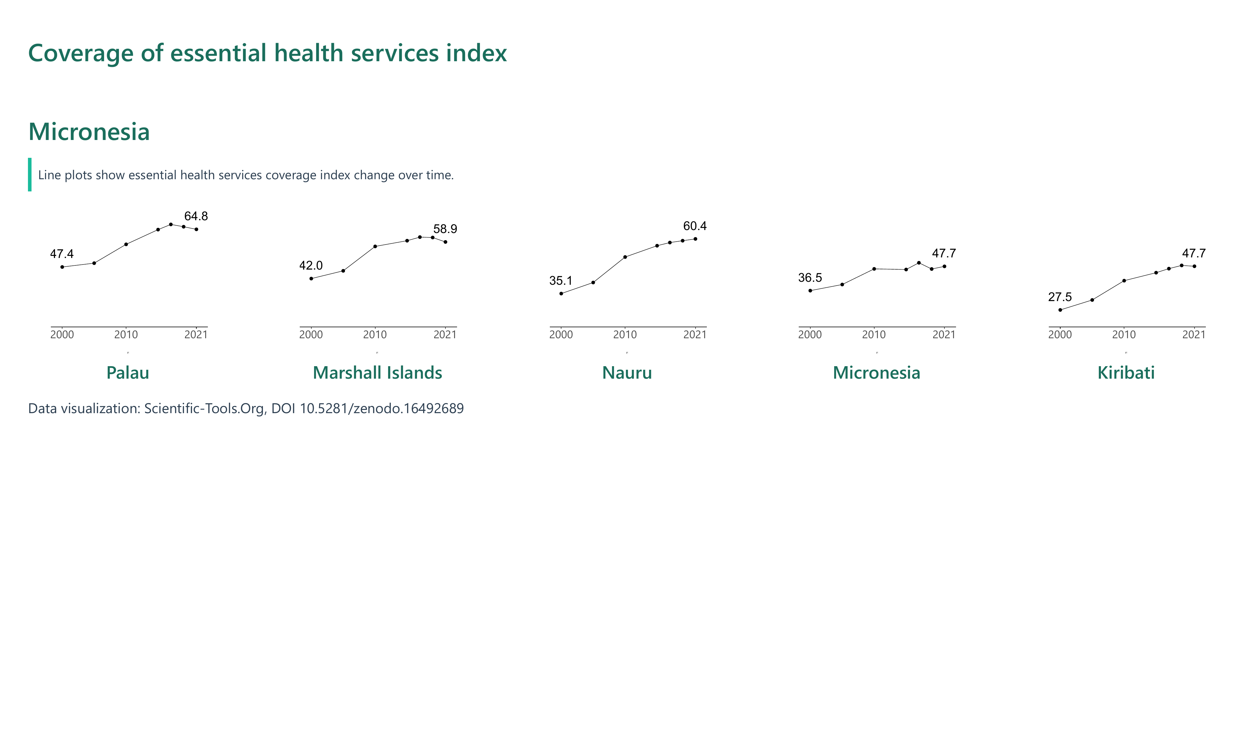 The essential health services coverage index in 2021 ranged from a low of 30.39 in Papua New Guinea to a high of 64.77 in Palau, highlighting significant disparities in access to core health services. Over time, some countries made notable progress: Nauru rose impressively from 35.09 in 2000 to 60.35 in 2021, and Palau advanced steadily from 47.37 to 64.77 over the same period. Similarly, Kiribati and Solomon Islands both demonstrated strong upward trajectories, increasing by about 20 points since 2000. These gains reflect sustained improvements in health system performance and investment.