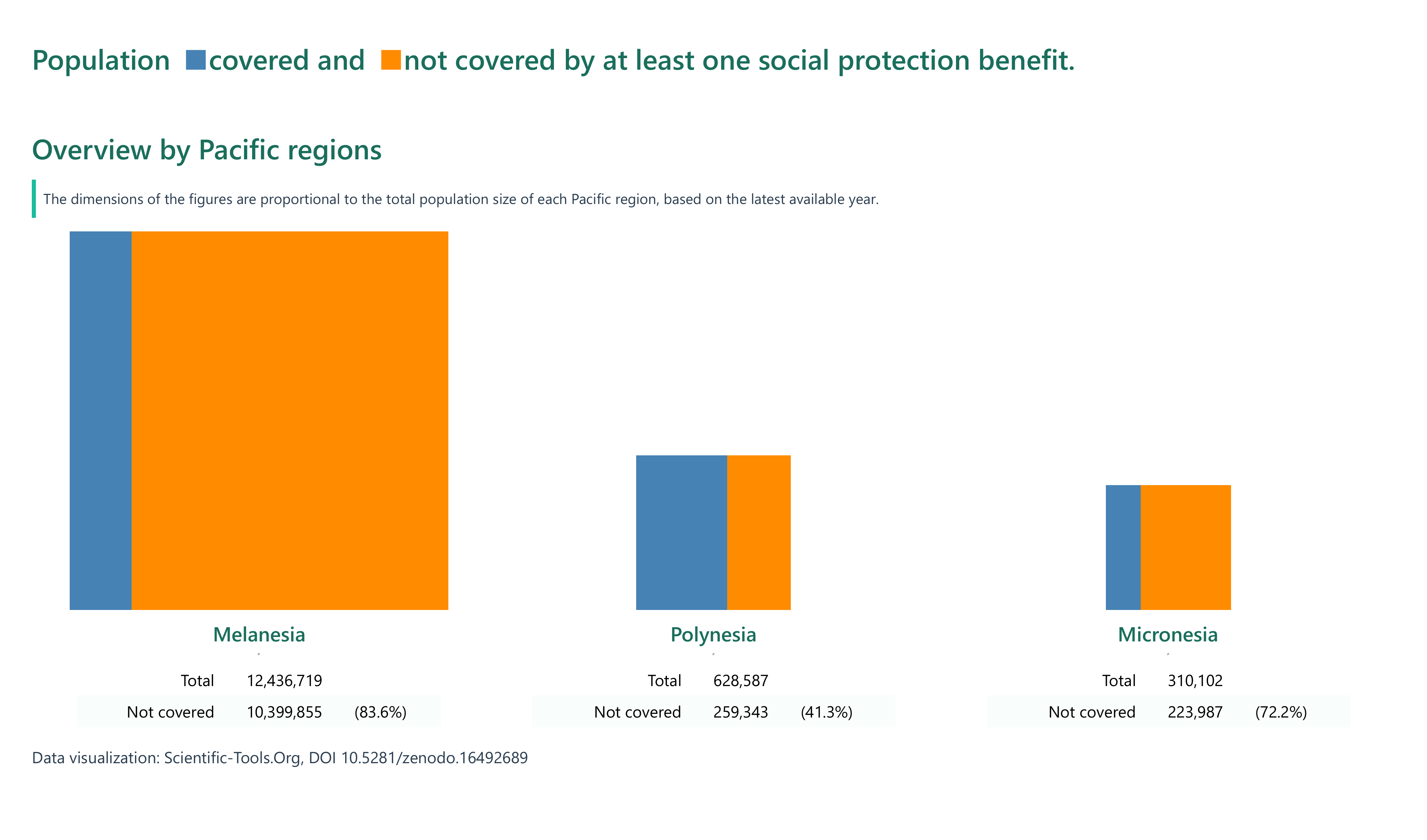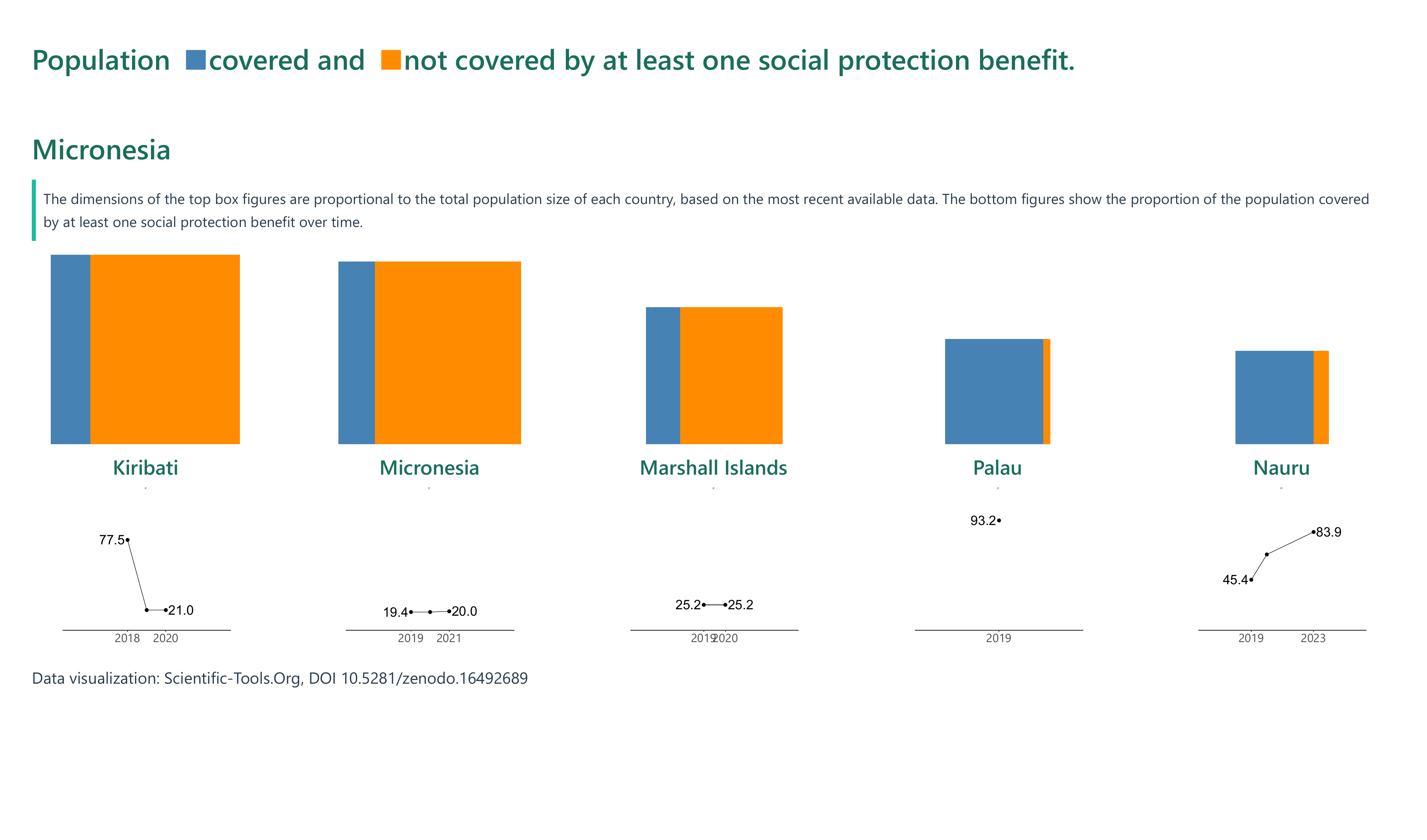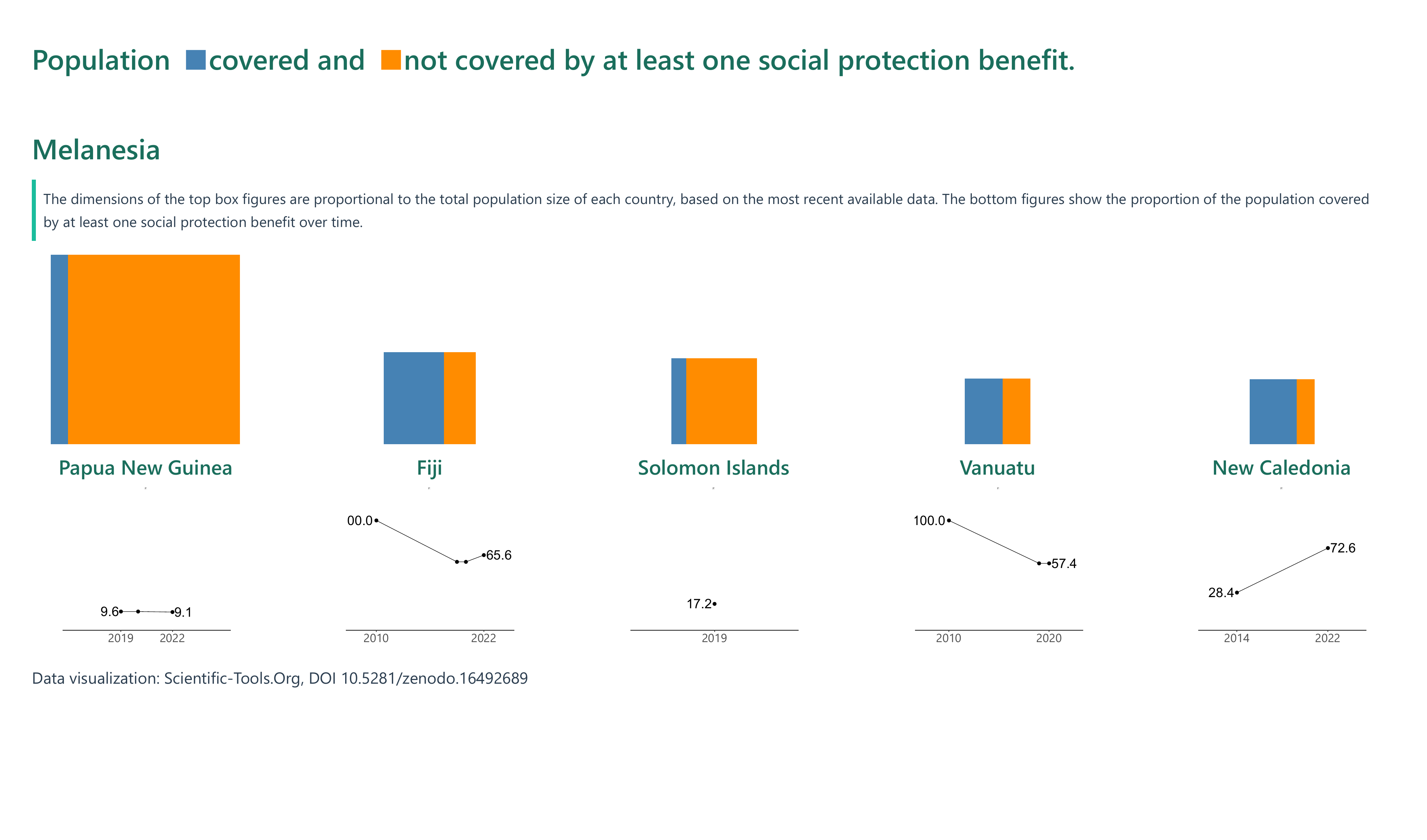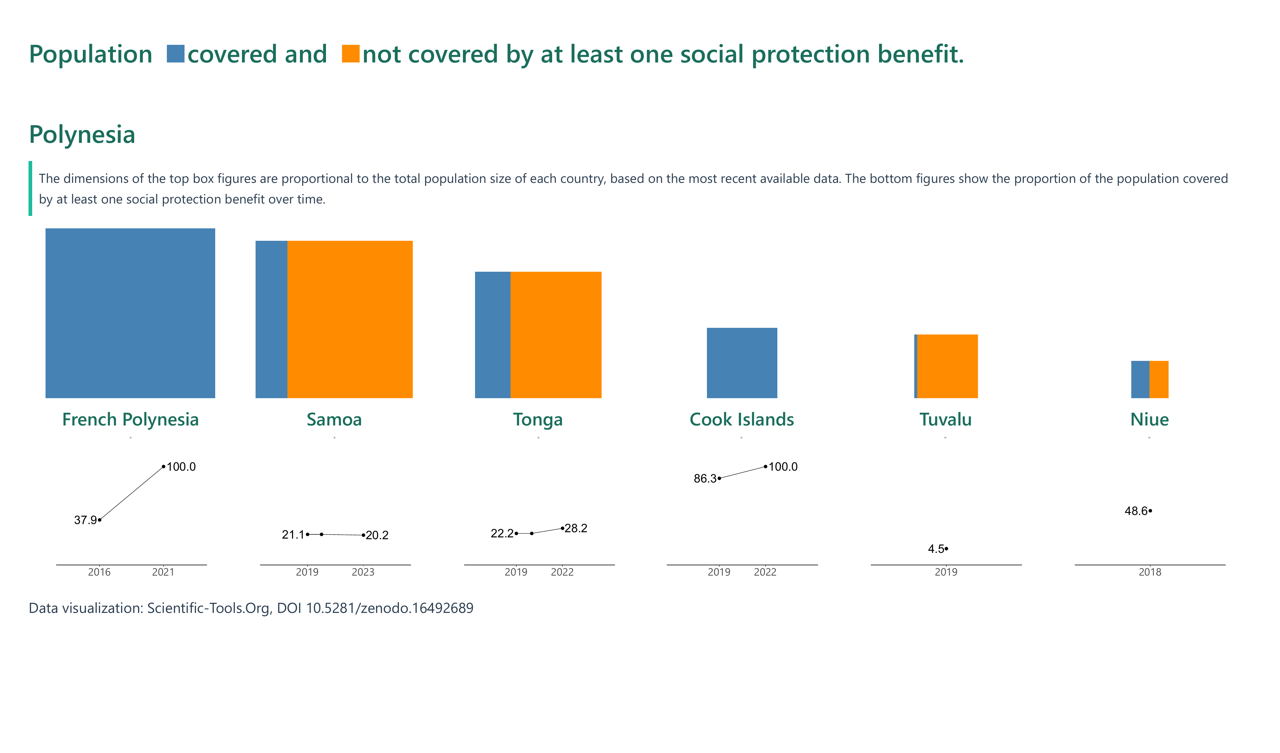 The proportion of the population covered by at least one social protection benefit in Pacific Island nations shows a wide disparity, ranging from as low as 4.5% in Tuvalu (2019) to 100% in countries like French Polynesia (2021) and the Cook Islands (2022). Notable progress was made in New Caledonia, where protection levels more than doubled from 28.4% in 2014 to 72.6% by 2022, and in Nauru, which rose steeply from 45.4% in 2019 to 83.9% in 2023.
